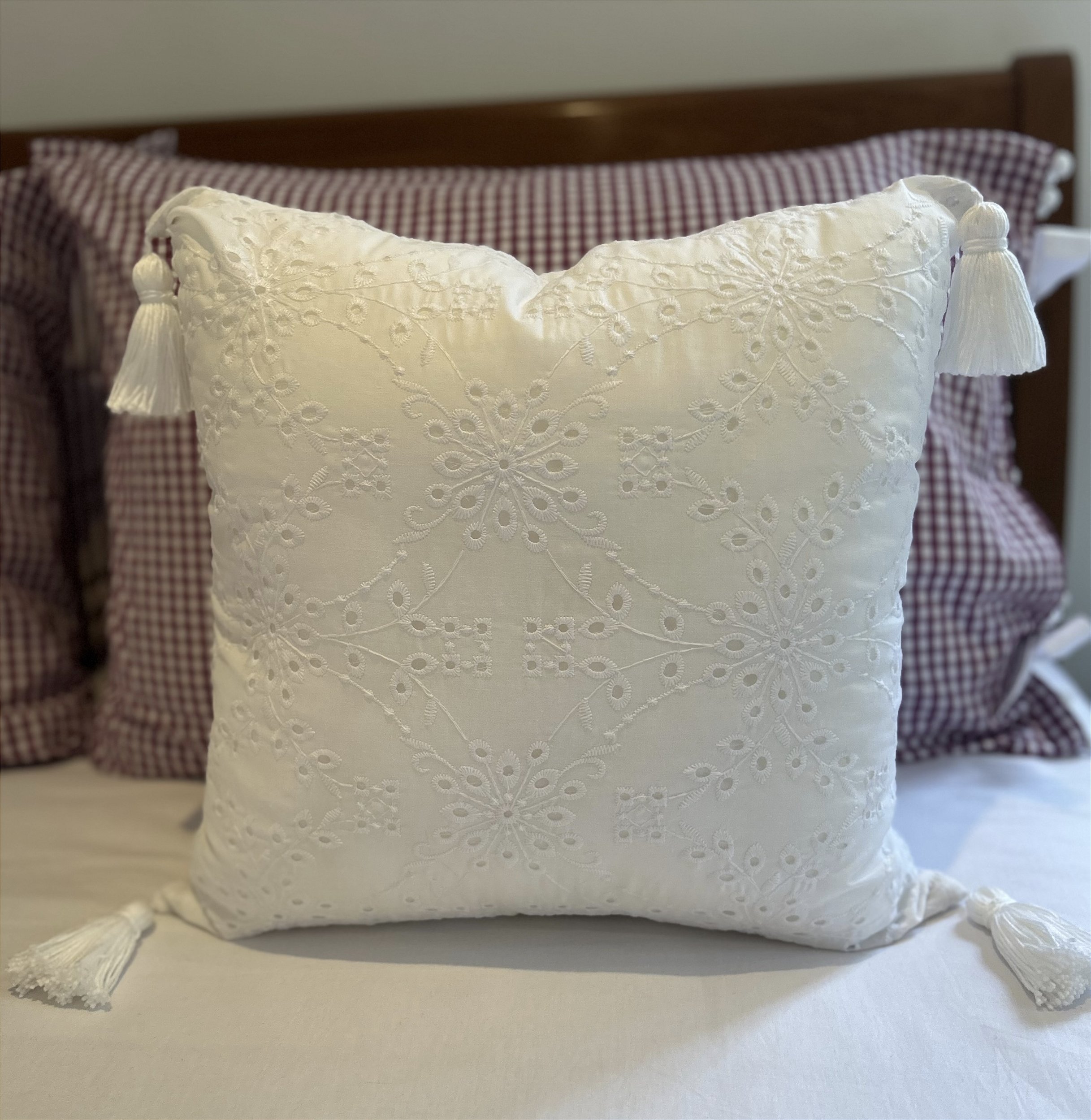 Almofada quadrada em laise branca 100% algodão, com tassel nas pontas,