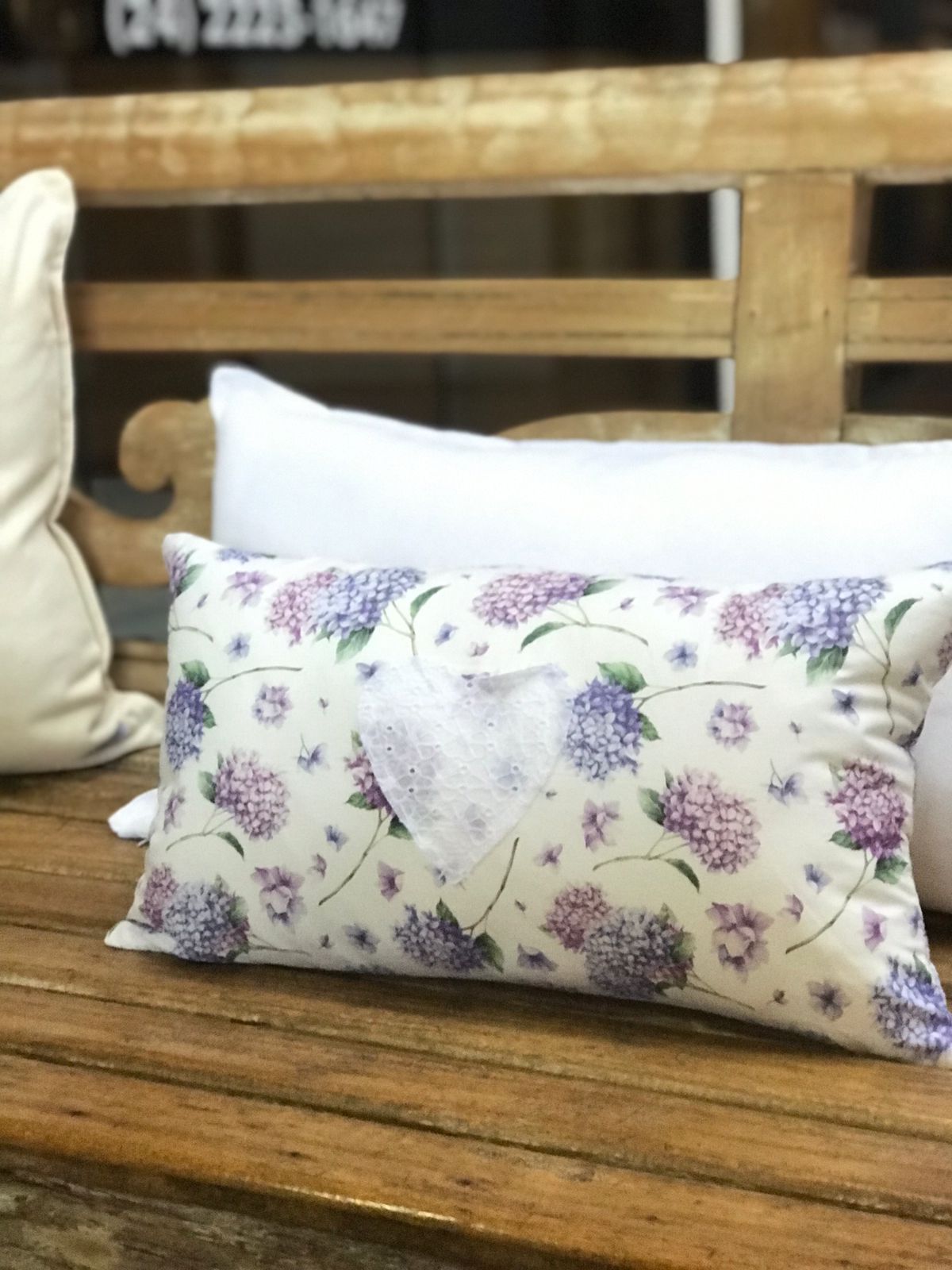 Almofadinha retangular estampa hortênsias, 100% algodão, com aplicação de coração em Laise branca