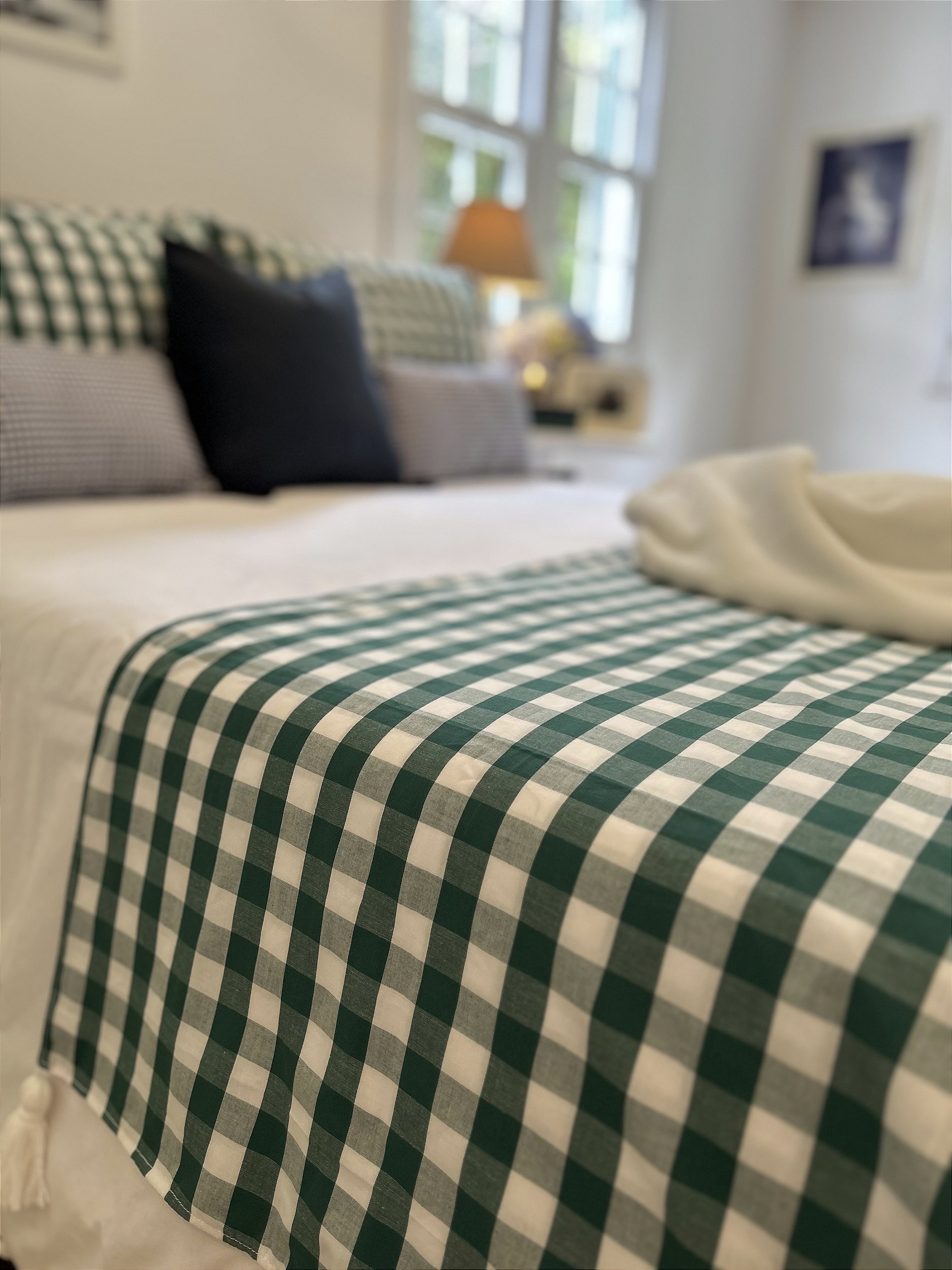Peseira xadrez (grande) cheia de charme e que dá um toque final na cama posta, em tecido leve 100% algodão com tassel nas pontas.