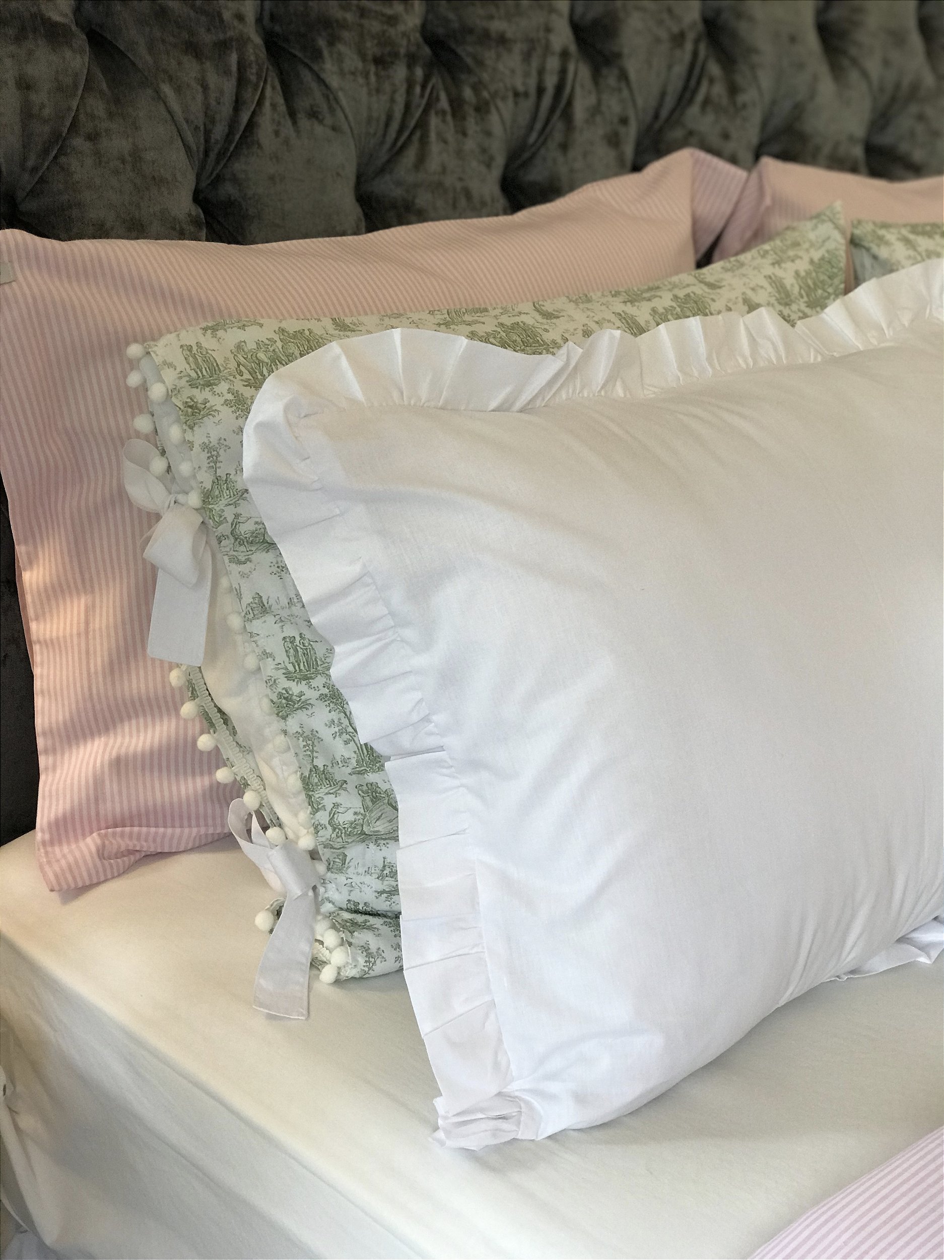 Porta travesseiro com babados ao redor, tecido xadrez 100% algodão fio tinto, super macio ao toque. Na cor branca é feito com percal 230 fios 100% algodão, toque super macio também. Os babados são feitos sem costura aparente que dão um acabamento perfeito, ideal para usar junto com as fronhas modelo laços e pompons e deixar a cama linda e cheia de charme!